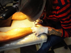 En la misma sala había dos animales 4×4 tatuándose toda la espalda y el pecho respectivamente, sin ni siquiera pestañear. Ante este panorama, gritar por mi mísera bolita hubiese sido bastante lamentable, así que aguanté el dolor más o menos como pude e intenté reirme con las tácticas disuasorias de tattoo man para que no pensara mucho en la aguja.